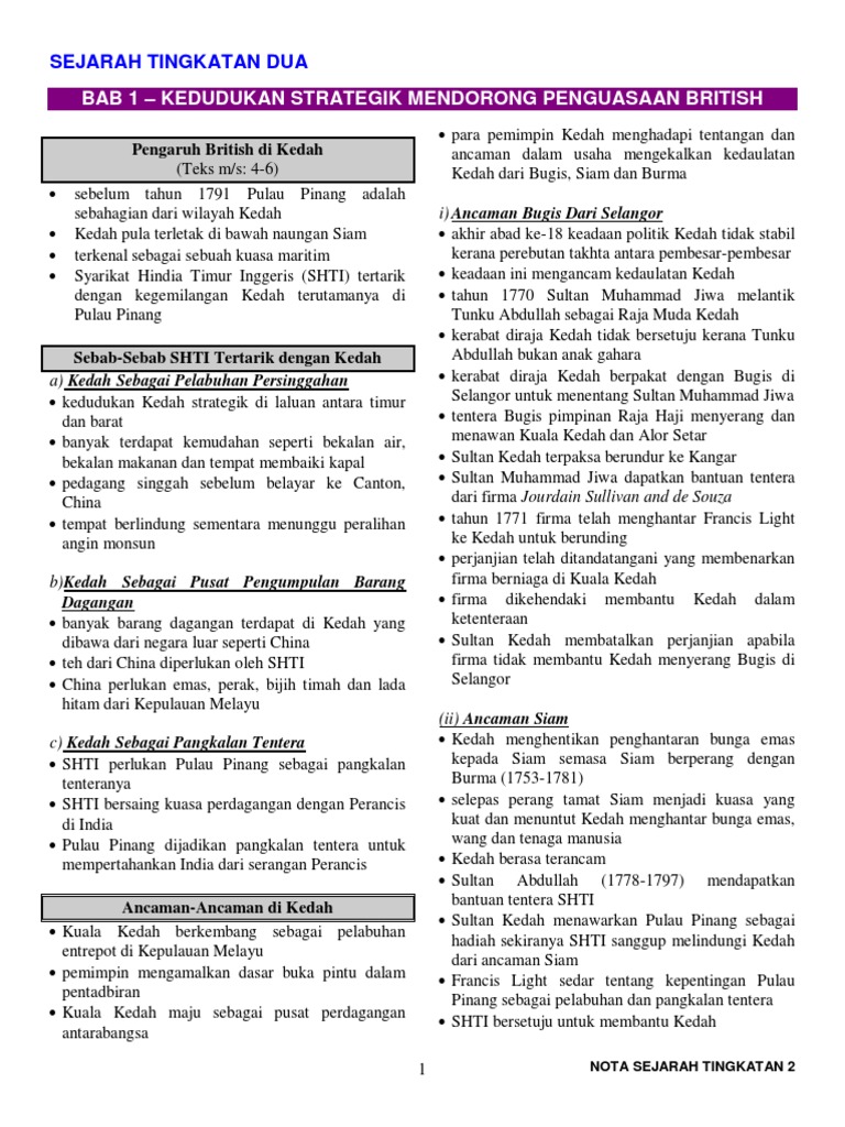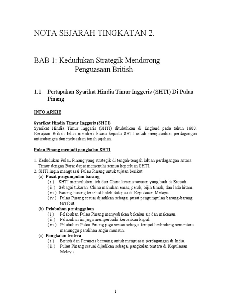 Syarikat Hindia Timur Inggeris : Syarikat hindia timur inggeris membantu kedah sekiranya diserang musuh2.. Majlis perundangan tersebut merupakan institusi pertama di negara yang mengadakan perbahasan. 1.1 pertapakan syarikat hindia timur inggeris (shti) di pulau pinang. .tylor) menunjukkan bahawa naning tertakluk penuh kedaulatan british dan syarikat hindia timur inggeris berhak memungut cukai pertanian 1/10 balik cukai 1/10 itu sepanjang dol said masih hidup oleh sebab pihak inggeris telah bertindak terlalu jauh untuk berpatah balik ke dasar asal, lagi pun ini. 4a) jelaskan kepentingan pulau pinang kepada syarikat hindia timur inggeris? Pulau pinang menjadi pangkalan shti shti tidak boleh menguasai kedah kerana siam mengakui bahawa kedah di bawah naungannya.